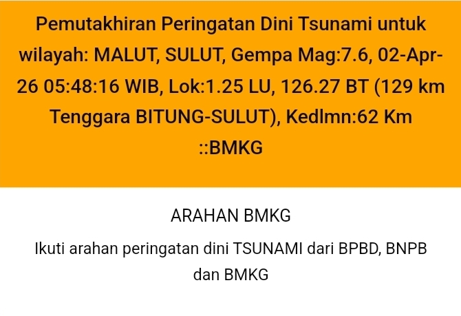 Gempa bumi berkekuatan magnitudo:7.6, 02-Apr-26 05:48:16 WIB, Lok:1.25 LU, 126.27 BT ini juga mengguncang wilayah Maluku Utara, Kamis (2/4/2026).